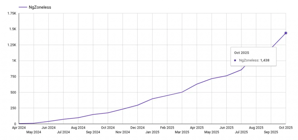 - 从 The HTTP Archive 外部观察,我们看到超过 1400 个 Angular 应用程序在使用 Zoneless 变更检测,这只是那些无需登录即可公开访问的应用程序数量。