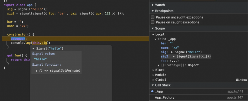 Angular 现在内置了 Signals 格式化器。启用自定义格式化器(Chrome、Firefox)以使用此功能。